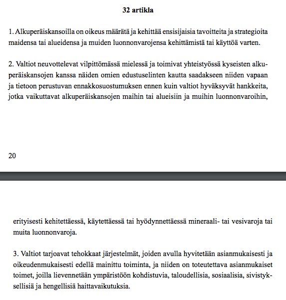 Suomi on äänestänyt tämän pykälän puolesta. Suomi on hyväksynyt tämän pykälän. Ja joka ainoa "Valtion maata"-kyltti Saamenmaalla rikkoo tätä pykälää vastaan.