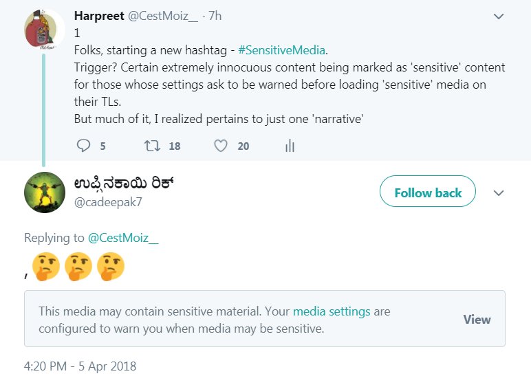 Trigger? Certain extremely innocuous content being marked as 'sensitive' content for those whose settings ask to be warned before loading 'sensitive' media on their TLs.