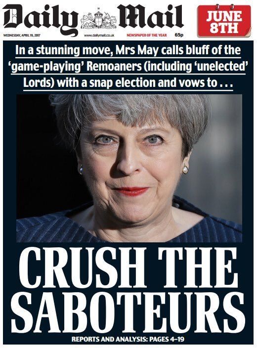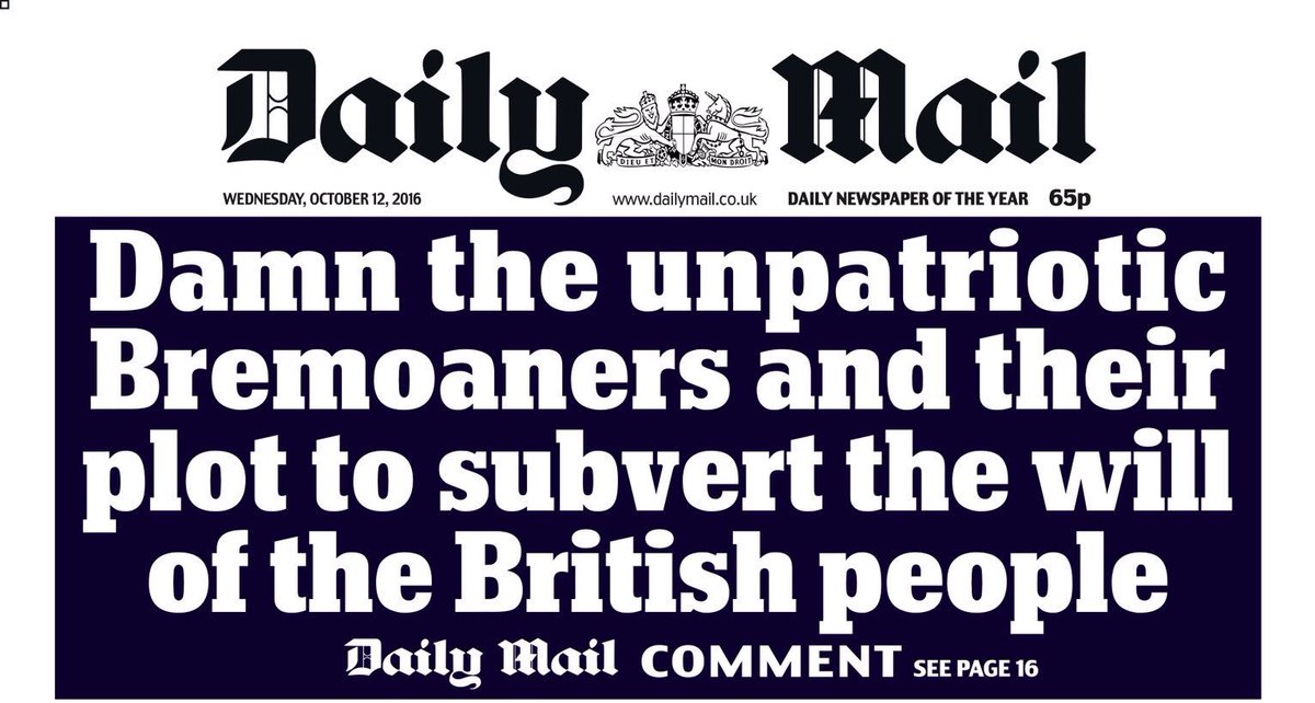 2/ The Daily Mail makes it clear who the opponents of the "Will of the People" are. They are the "enemies of the people". And with that the floodgates are opened to a tide of hate directed against opponents of #Brexit, saboteurs, plotters, mutineers etc.
