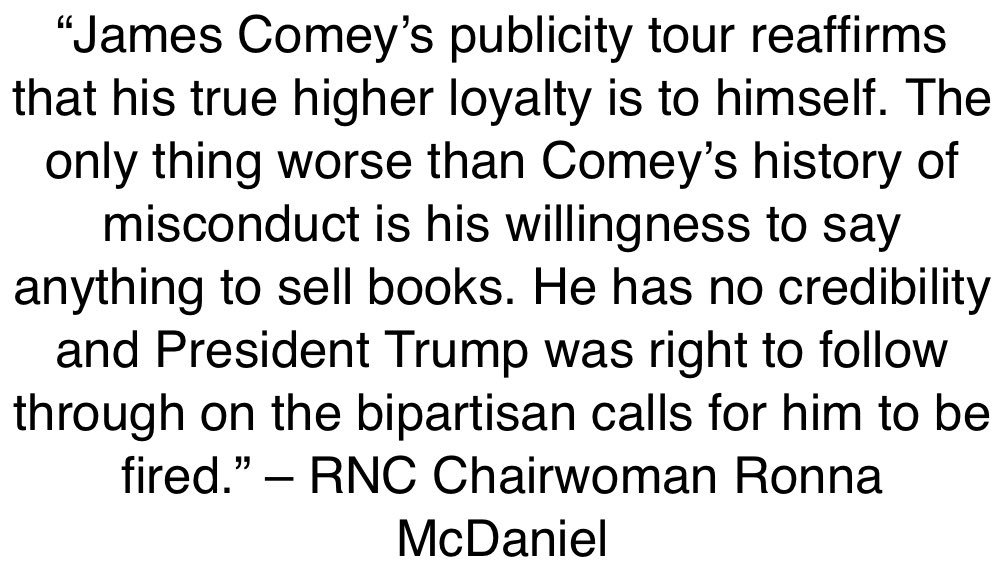 “James Comey’s publicity tour reaffirms that his true higher loyalty is to himself.“