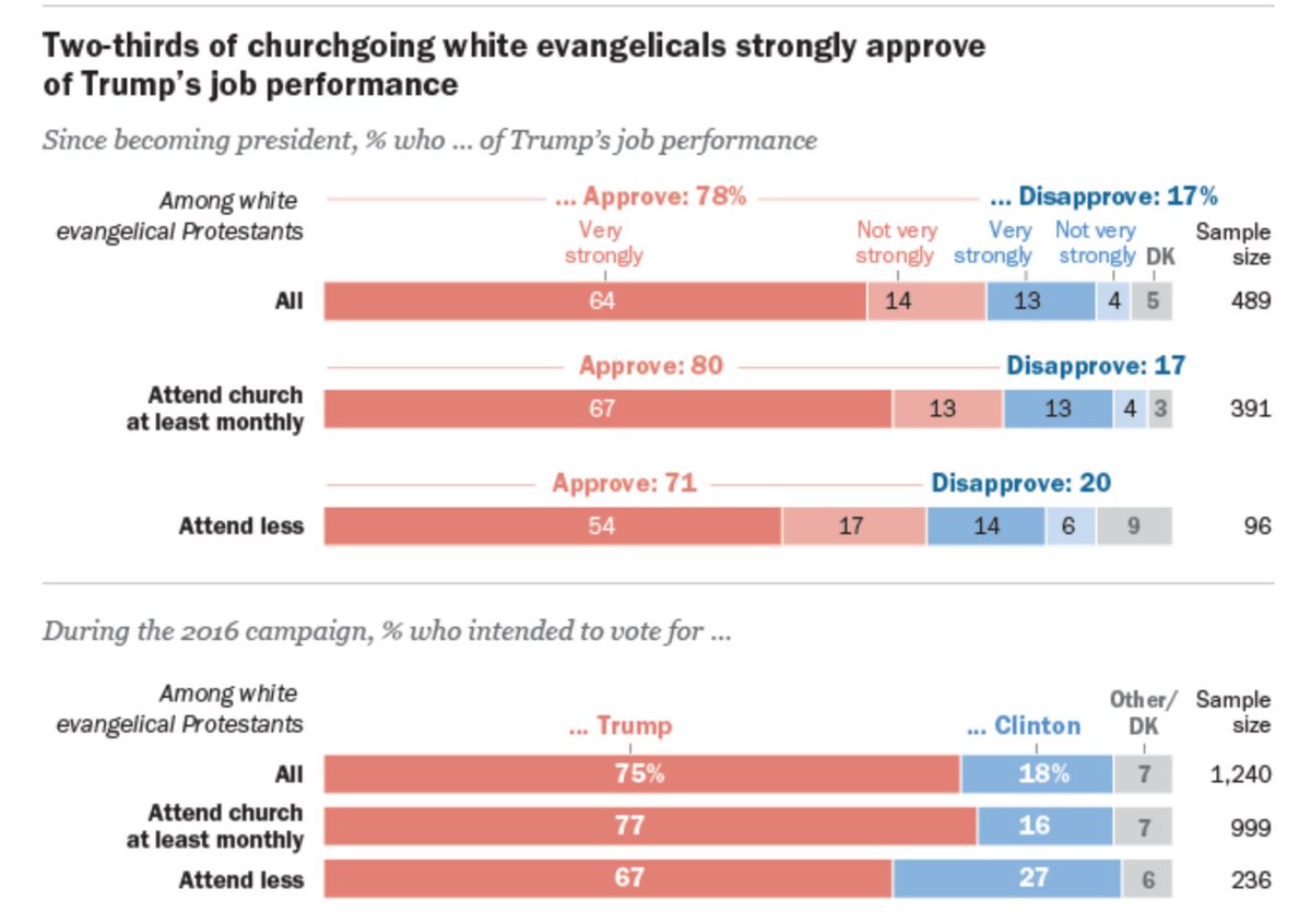 Some 78% of white Evangelicals approve of Trump's job performance. That is the highest sub-demographic among all voters. The strongest support for Trump. Despite the lying and corruption and adultery and racism and all the rest, 78% still approve of him.