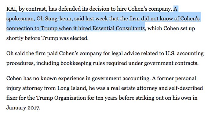 Then in November Trump meets in South Korea with the SK president, who has publicly lobbying on behalf of KAI ... at the end of Nov KAI pays Michael Cohen (the other one) $150,000