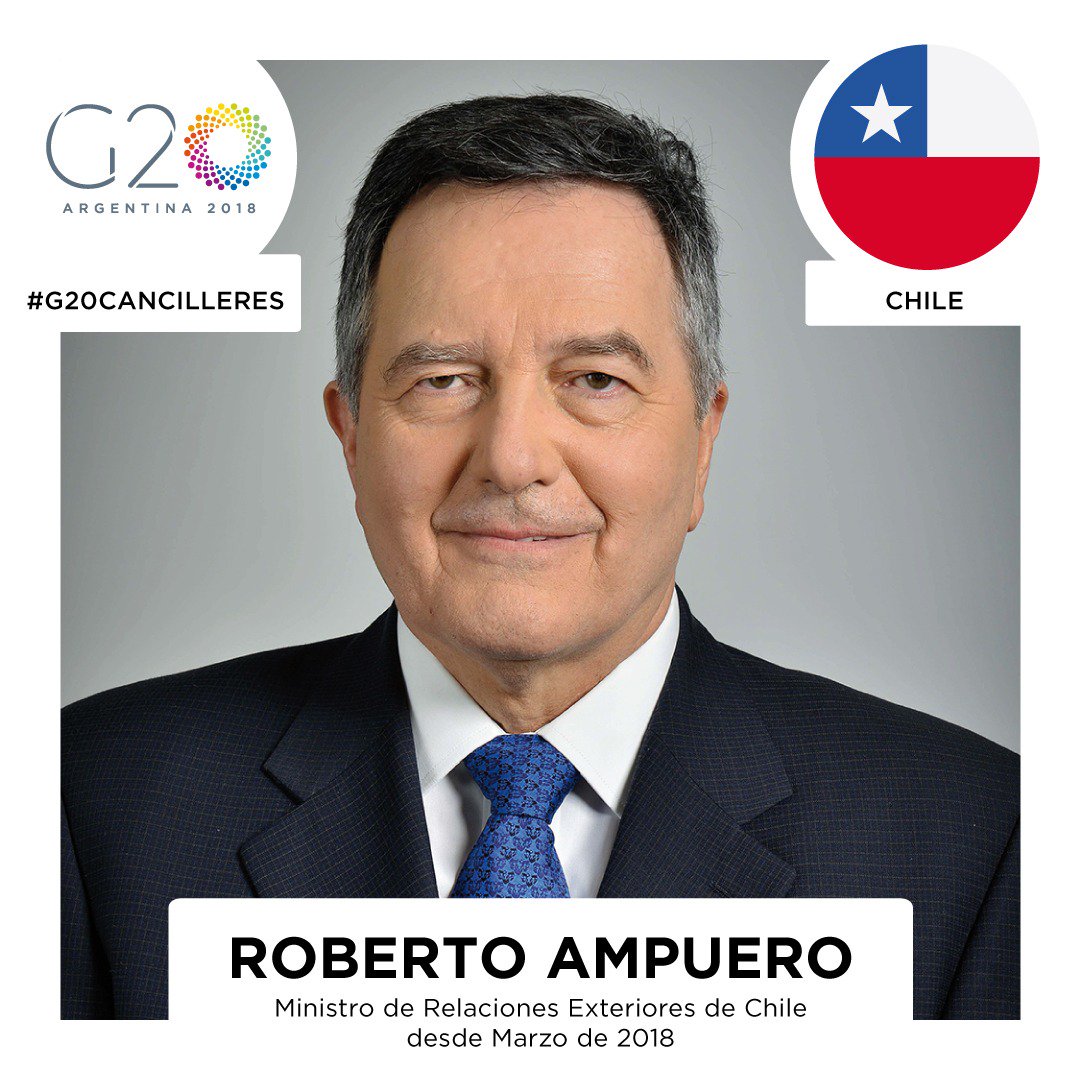 Participantes de la Reunión #G20Cancilleres: Ministro de Relaciones Exteriores de Chile🇨🇱 @robertoampuero, es lic. en Literatura Latinoamericana de la Universidad de La Habana y autor de más de 15 novelas, memorias y libros sobre asuntos políticos.