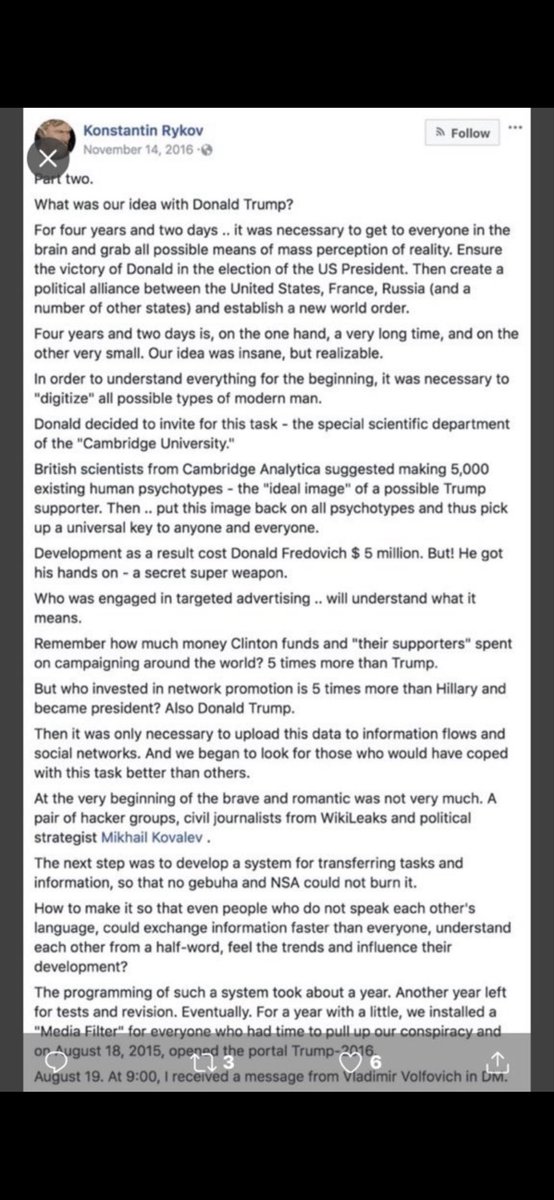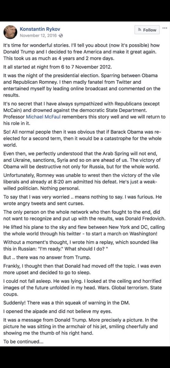 This was posted by Konstantin Rykov on his Facebook page on November 12, 2016, nearly four years to the day after the reelection of Obama in 2012. Read every single word of both pages. Twice.