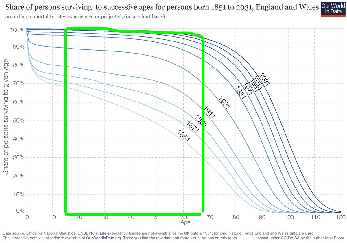 The expected working lifespan of a human at birth has increased by 127% over 160 years. Even though we work to approximately the same age.
