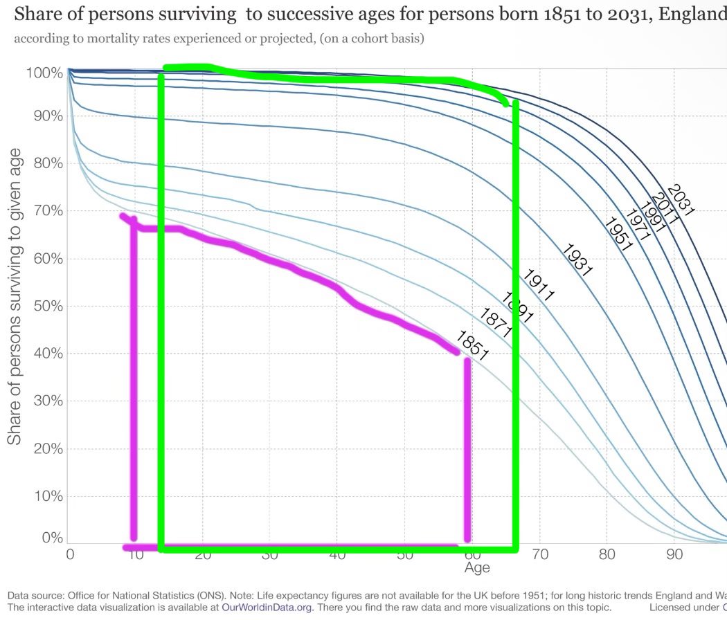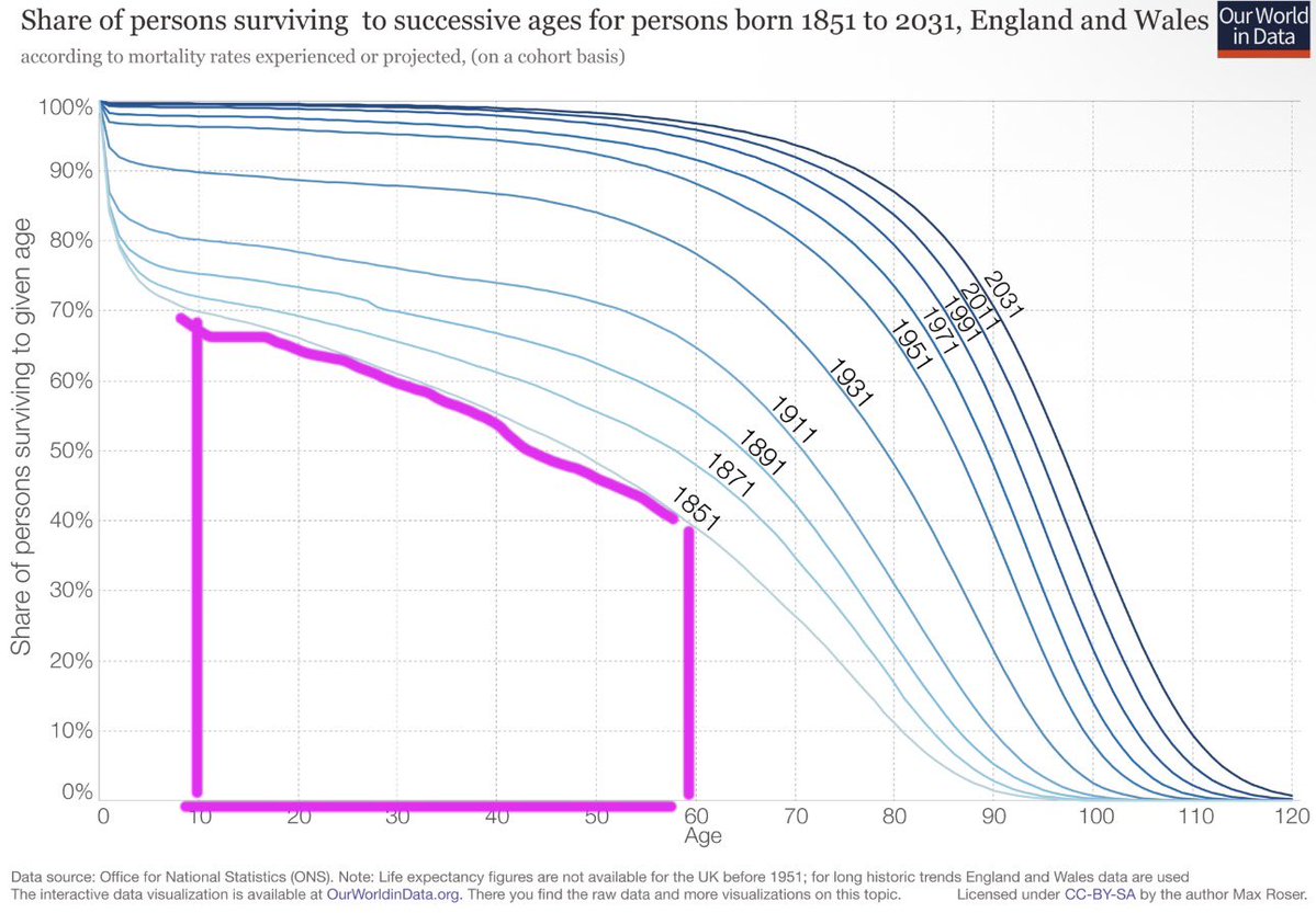 The pink zone on the left chart shows the useful economic life of 1 human birth in the year 1851.