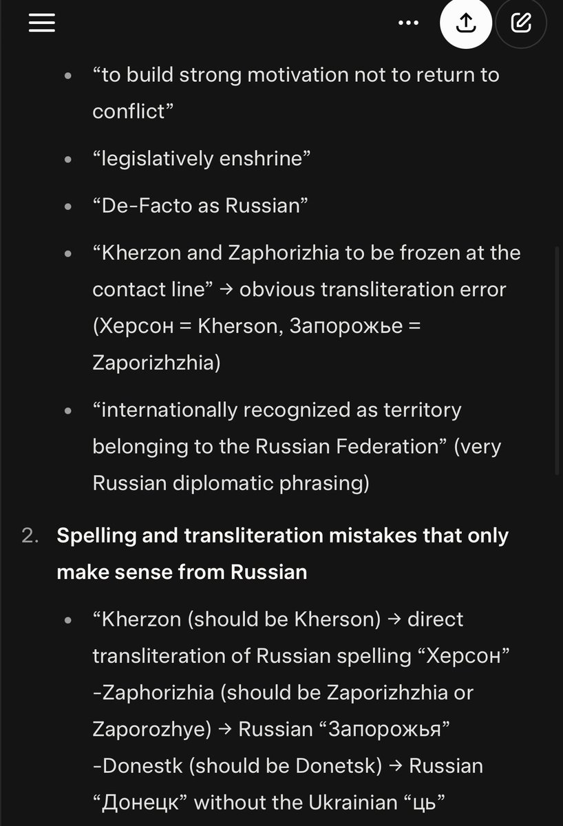 “The combination of transliteration errors (Kherzon, Zaphorizhia), Russian bureaucratic phrasing, and political vocabulary leaves no realistic doubt about the original language being Russian.”