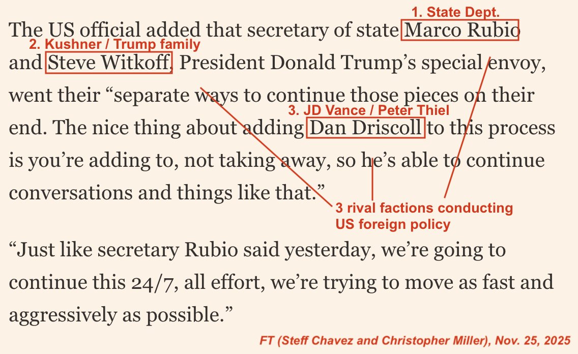 Chaos: two rival factions - one tied the president and one to the VP - are trying to set US policy on Ukraine, cutting out the State Dept. Each pushes Ukraine to surrender, then leaks to press to claim they are official. FT now reports Vance's faction is holding its own talks. 1/