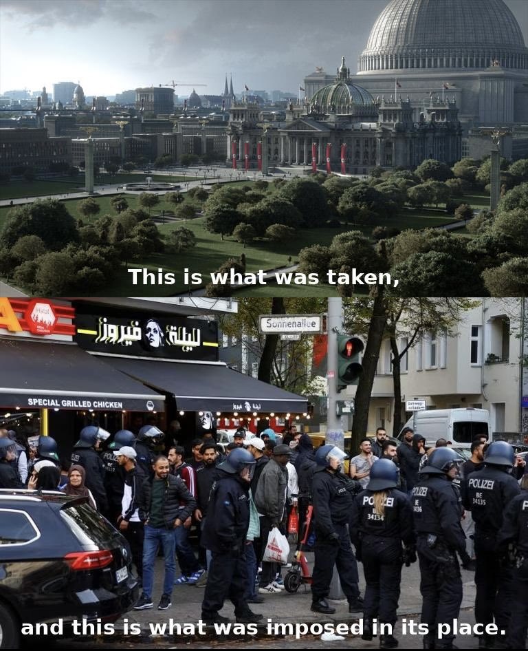 Is there a single honest man who still believes WWII served anyone but the Weltfeind? Nuremberg never ended. The Trials became doctrine, the guilt became creed, and the gallows became HR departments, speech laws, and rituals of compulsory shame. In Germany today it is literally illegal to take pride in the nation your forefathers forged while your women cannot walk safely in their own streets and your Christmas markets must be shuttered lest they become targets (again!) for the “new Germans” to showcase how much they hate you.