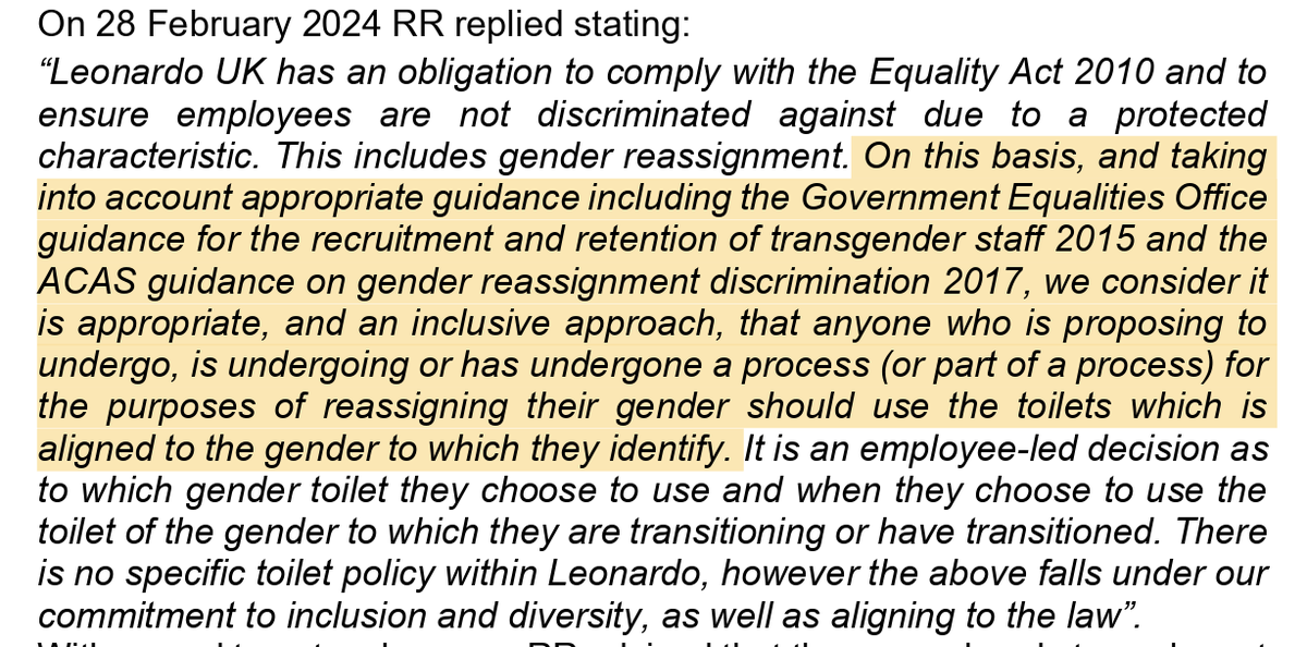 Leonardo’s policy is that any member of staff who is proposing to to undergo, is undergoing or has undergone a process for the purposes of reassigning their gender can use the toilets intended for the opposite sex.