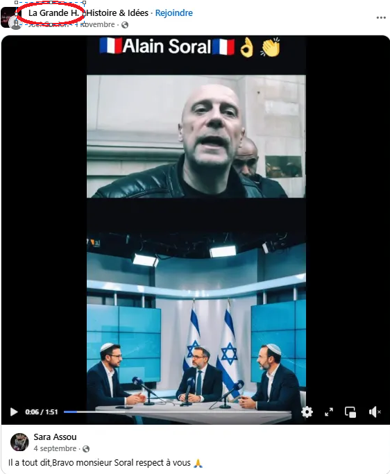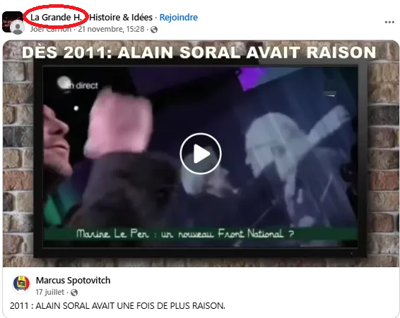 Sur le groupe FB "La grande H", dont il est admin, Julien Théry a partagé des posts antisémites & des publications de P-E Blanrue, antisémite notoire publié par Soral. Figurent aussi des vidéos de Dieudonné et de Soral ("Soral avait raison" / "Bravo monsieur Soral")