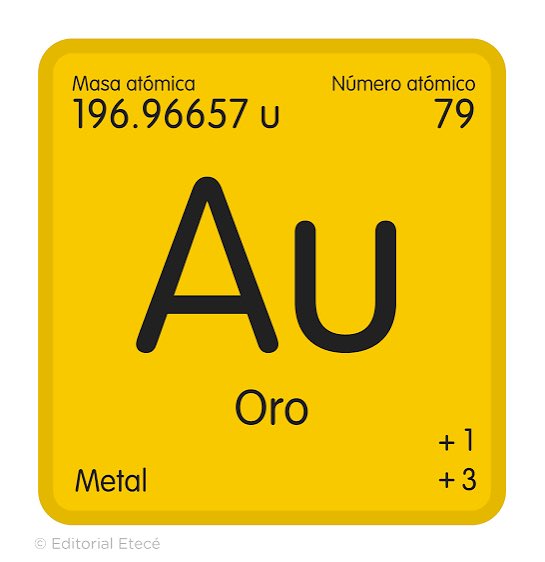 Elemento químico connúmero atómico 79; es un metal muy denso, blando y de color amarillo intenso. Se clasifica como metal pesado y noble; es el más común de los metales preciosos. El cobre, la plata y el oro están en el mismo grupo en la tabla periódica.
