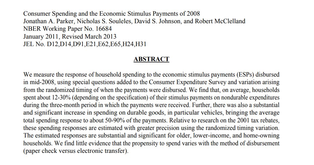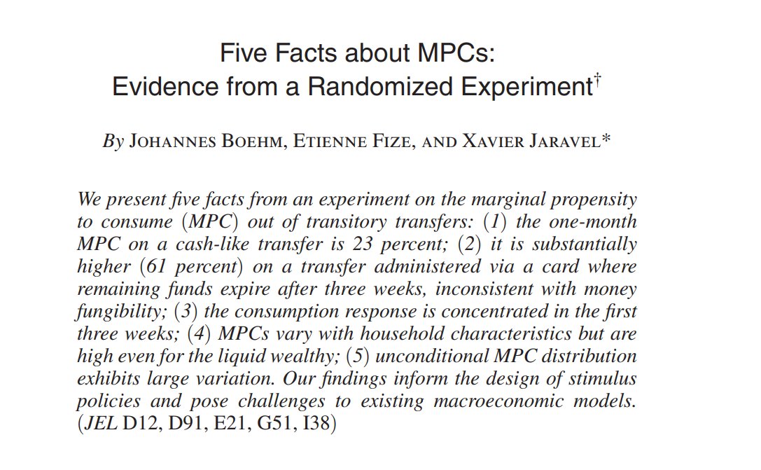 Previous micro work on the MPCs take two basic paths. With Parker et al (2013), the identifying variation is coming from random variation in which people actually received their checks.