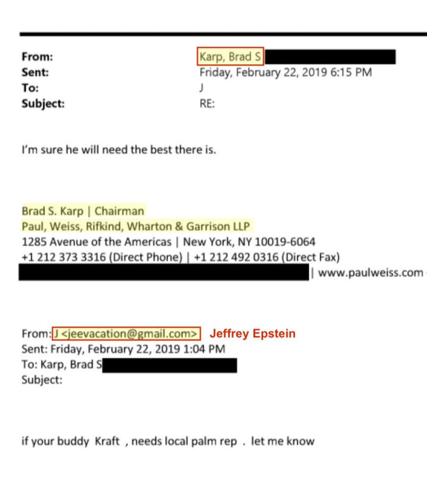 Some people flagged this 2019 Jeffrey Epstein email exchange because it's about the owner of the Patriots. But see who it's WITH: Brad Karp, the chairman of Paul, Weiss. And Karp was still chair when Paul, Weiss became the first law firm to cave to Trump's demands in 2025. 1/