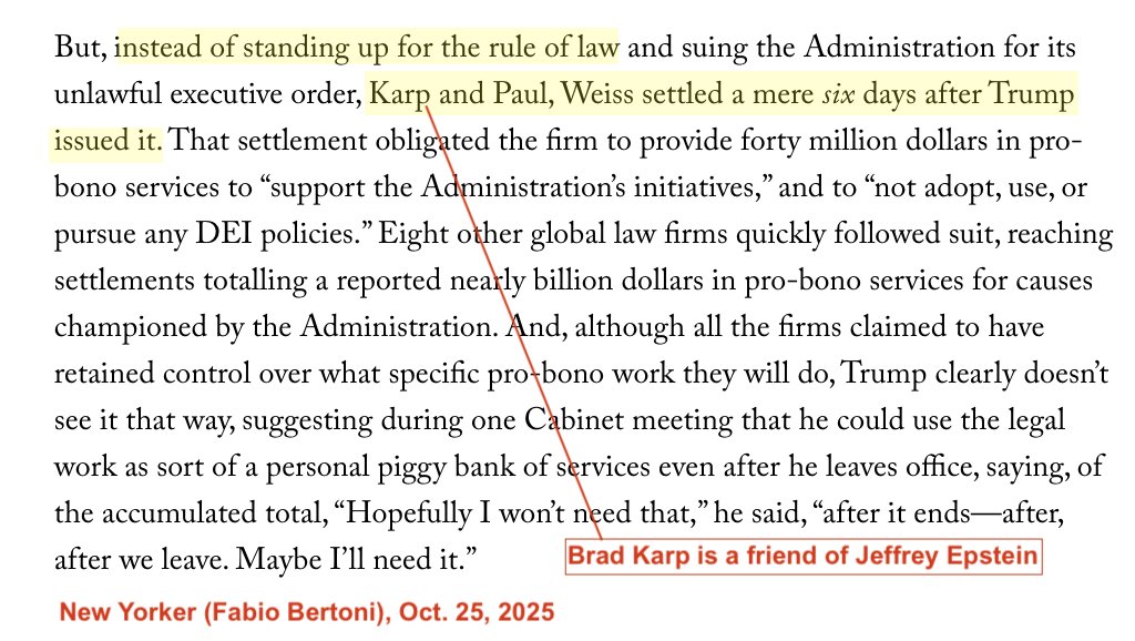 Brad Karp ordered Paul, Weiss to settle with Trump just six days after getting his crazy demands. The New Yorker, baffled, thought the issue might be that a Paul, Weiss partner had worked for Robert Mueller. But maybe it's all even simpler and stupider. 2/ web.archive.org/web/2025110502…