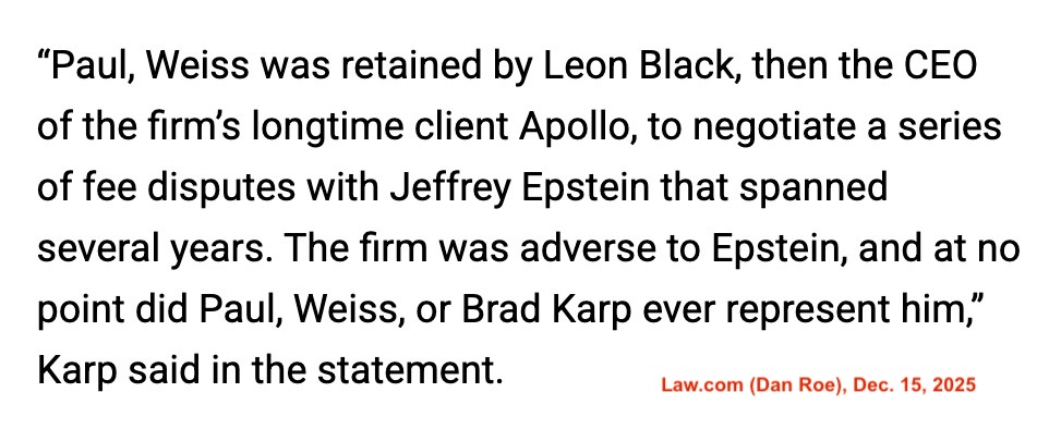 Just last month Brad Karp was asked about his relationship to Epstein. He denied any relationship and said he knew Epstein only as a legal adversary. Guess it's time to call him up at Paul, Weiss and ask those questions again. (h/t @chrisgeidner) 3/ law.com/americanlawyer…