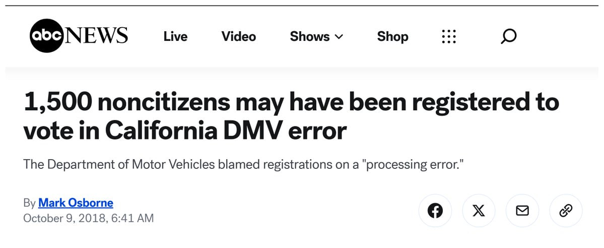 This isn't even new. In 2018, California's DMV admitted that approximately 1,500 noncitizens were 'accidentally' registered to vote through their "motor voter" program.