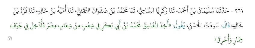 This is also attested to through another immediate reporter, Qura b. Khalid who mentions how al-Hasan recounts Muhammad b. Abu Bakr’s demise in a rather gleeful way.