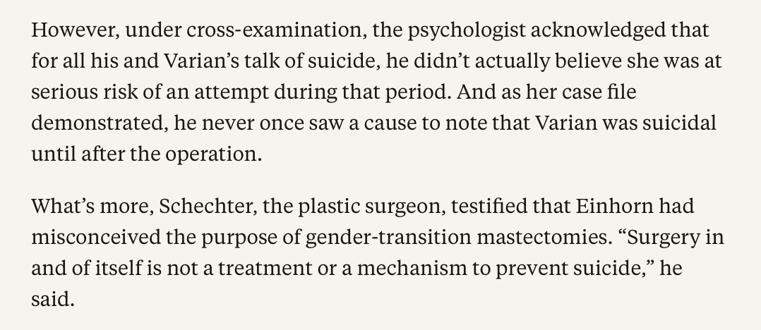 Dr. Loren Schechter, the head of gender-affirming surgery at Rush University Medical Center in Chicago and the president-elect of the World Professional Association for Transgender Health (WPATH), testified that gender-transition surgery is not form of suicide prevention. thefp.com/p/a-legal-firs…