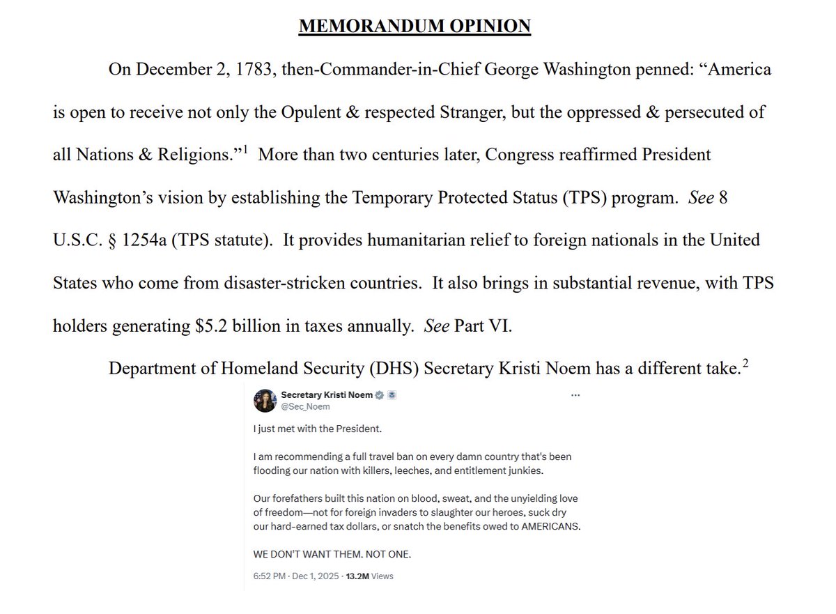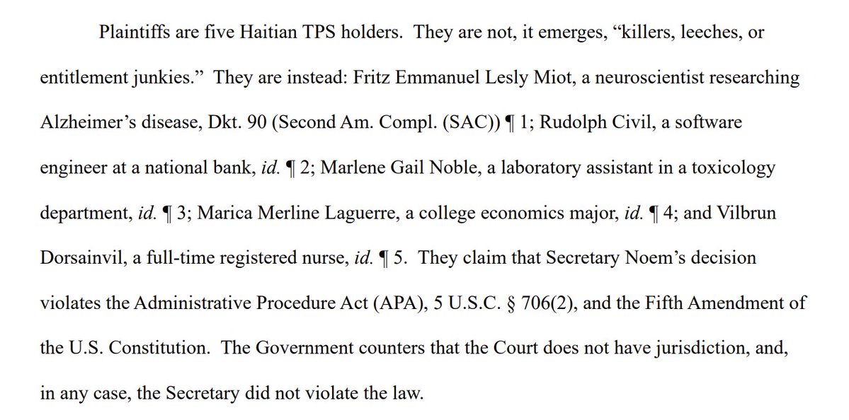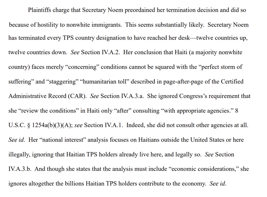 Right at the top, Judge Reyes lays out her official findings, after reviewing the evidence. She says it is "substantially likely" that Secretary Noem's decision to end Haitian TPS was "preordained" and based on Secretary Noem's general "hostility to nonwhite immigrants."