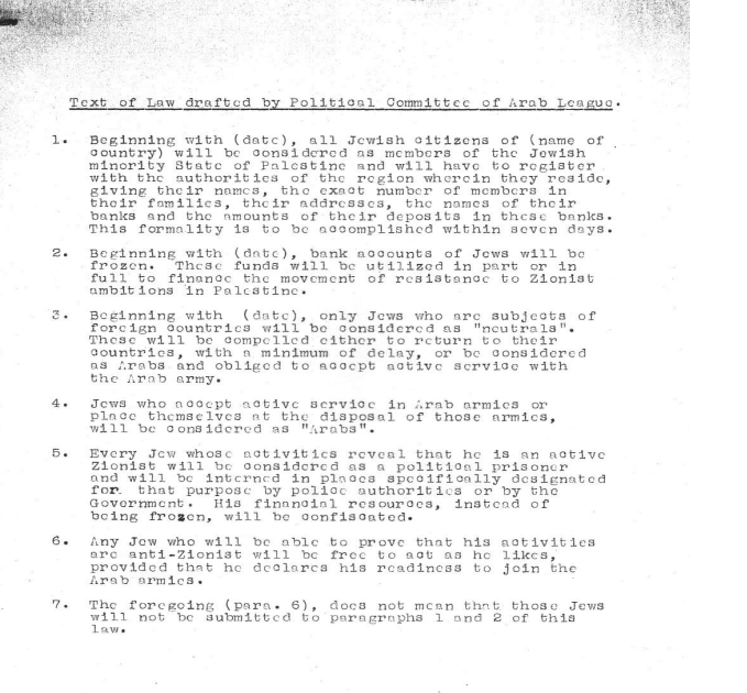 Photocopy of a document entitled: “Text of Law Drafted by the Political Committee of the Arab League”.