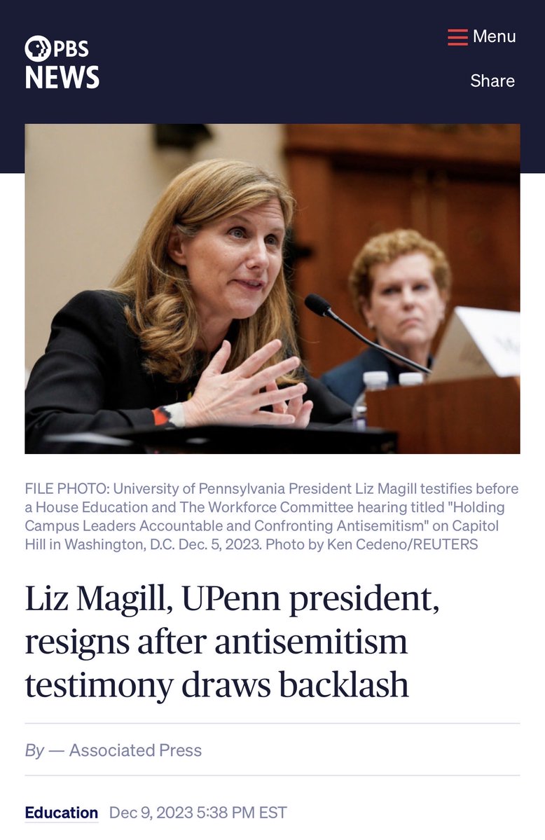 Magill resigned from her position at Penn in December 2023 following widespread criticism of her testimony before a congressional committee that was investigating antisemitism on college campuses. During the hearing, when asked whether calls for the genocide of Jews would violate university policy, Magill responded that it "depends on the context," a statement that drew significant backlash and contributed to her departure and resignation .