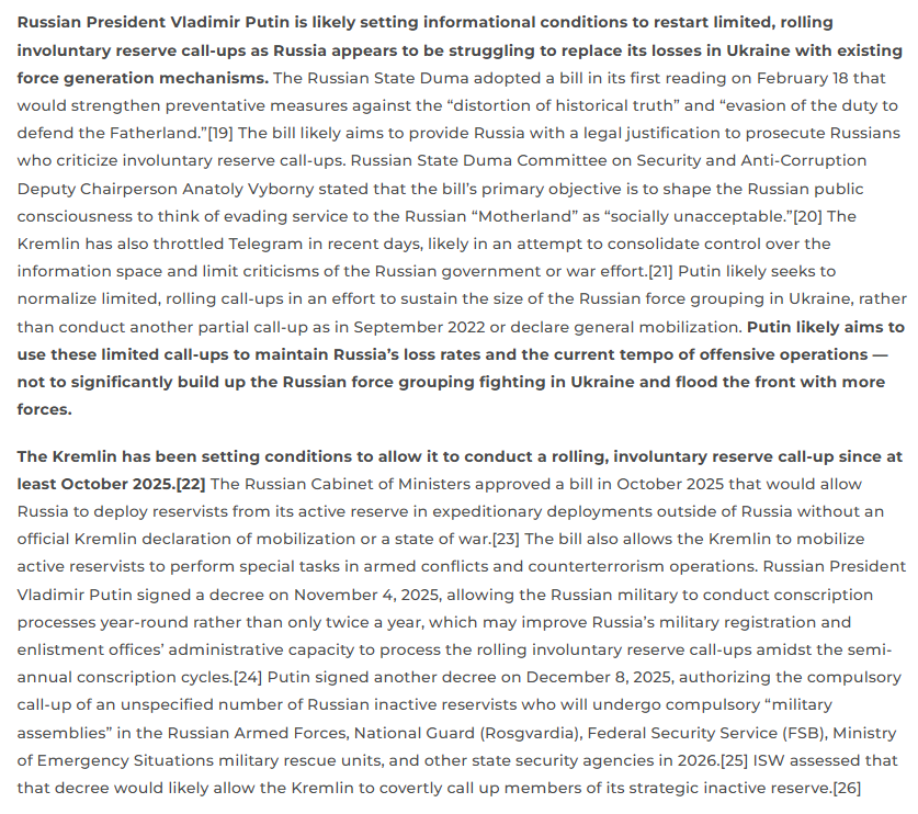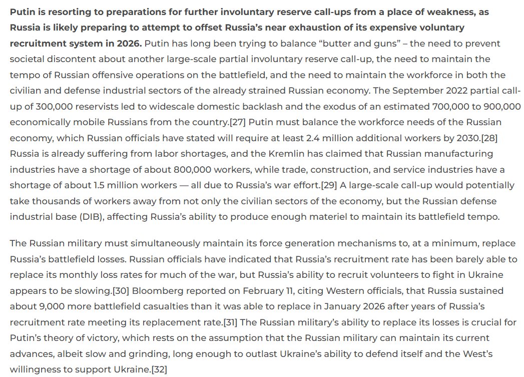 3/ Putin is resorting to preparations for further involuntary reserve call-ups from a place of weakness, as Russia is likely preparing to attempt to offset Russia’s near exhaustion of its expensive voluntary recruitment system in 2026.
