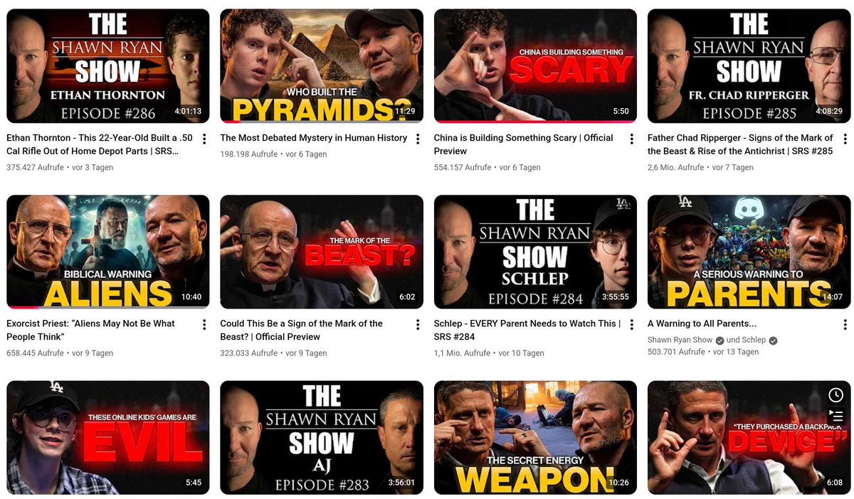 Konservative Polit-Influencer wie Shawn Ryan, ein ehem. Navy SEAL, liefern ihrem Publikum spannendes Edutainment mit abwechslungsreichen Themen von Militär, Engeln, Außerirdischen, Penis-Verlängerung bis zu finsteren Machenschaften Somalischer Gangs. 2/9 youtube.com/@ShawnRyanShow…