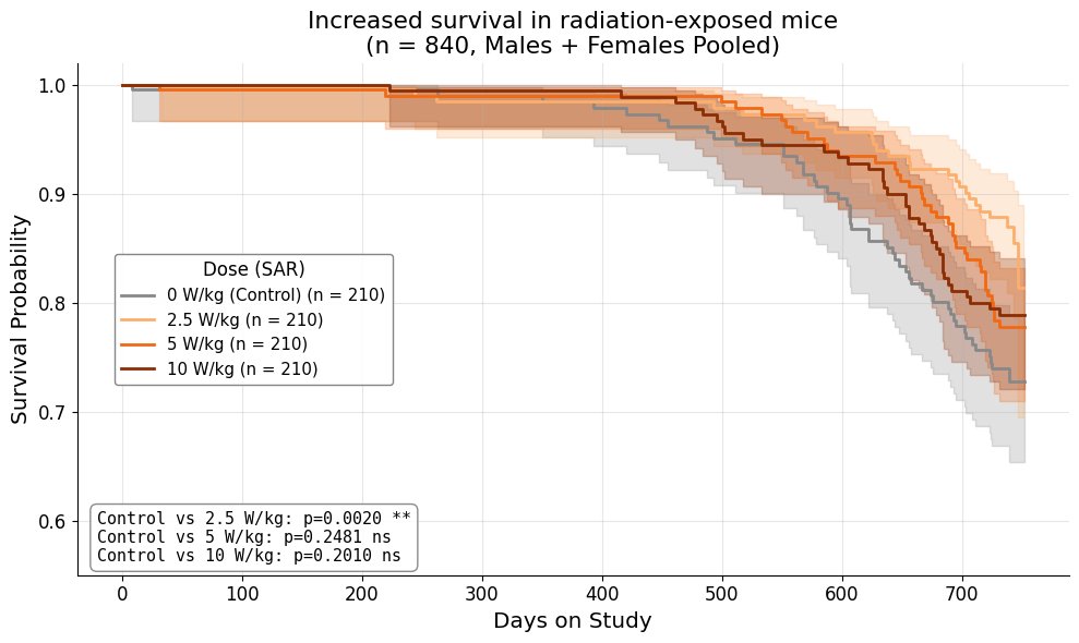 they had a 53% LOWER risk of death (HR=.475, p=0.003) than the mice dosed with no radiation!!!