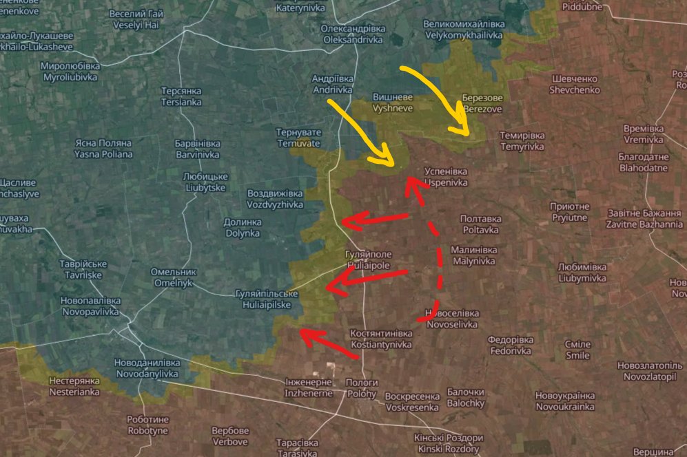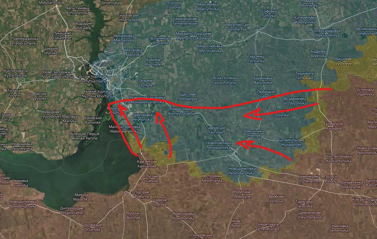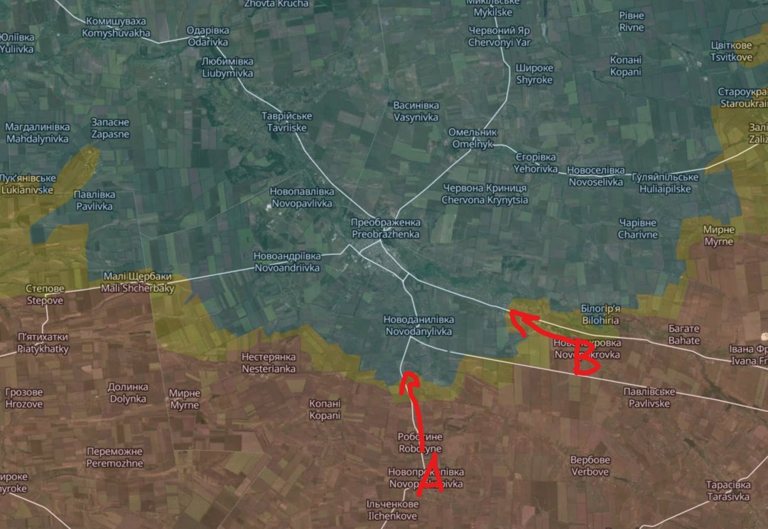 Recently, Russia tried an armored assault on Orikhiv, which failed badly (A). They also tried to advance through Mala Tokmachka (B) before, but that failed too. A direct attack on Orikhiv is unlikely to succeed without heavy losses, so Russia wants to avoid it unless they have no choice. Still, based on past experience, they might end up having to take the town this way.