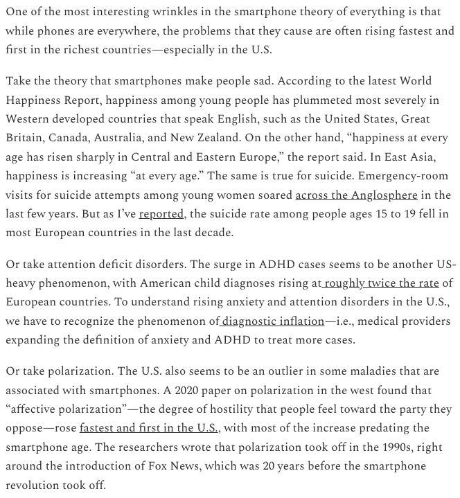 Compulsive phone use along with under-regulated social media produce widespread youth anxiety, attention issues, polarization, populism, and institutional distrust in: 1. highly individualistic societies, with 2. a culture of diagnostic inflation [i.e., expanded diagnostic guidelines for anxiety and ADHD], plus 3. negative-affect prevalence [i.e., people online constantly talking about their anxiety and ADHD], and finally 4. high levels of negativity in their news ecosystem