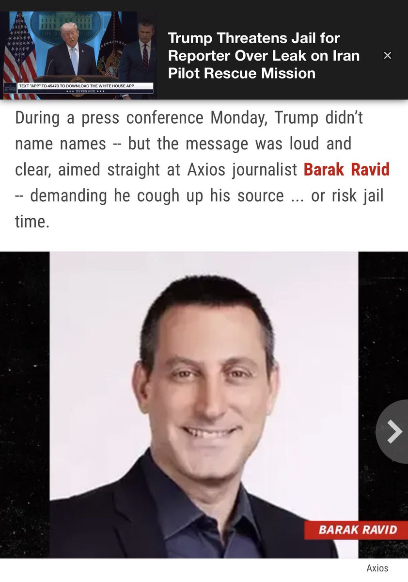 Now the move. The unnamed sources are the propaganda. President ALL CAPS’s jail threat is the propaganda. You promote your propaganda. President ALL CAPS threatens Ravid with jail on April 6 because the threat is the promotion. “These sources are so valuable we will prosecute a reporter to protect them.” Translation: please listen to the two guys. The jail threat is the quality stamp. The hack is the refund receipt. The pinned tweet is the fine print. Three mechanisms, three directions, same frame. Ravid’s sources get the jail threat so you take them seriously. Sherman’s post gets the hack claim so you do not take her seriously. The pin stays up for eleven days so the careful reader can find the moment under the denial. The frame is F-15E. The jail threat certifies the official. The hack decertifies the unofficial. The pin preserves the evidence. The photographs sit underneath the whole production doing their own work for anybody who bothers to look, which is nobody with a byline.