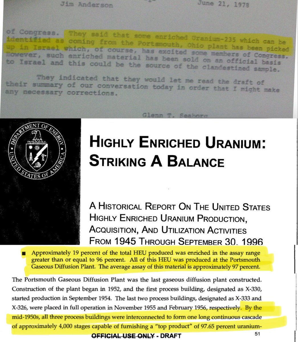 Dr. Seaborg inadvertently admitted that the isotopic signature of U.S. highly enriched uranium was found outside Israel’s nuclear plant in Dimona, as the greater than 96% enrichment was exclusively produced in Portsmouth, the exact type of enriched uranium that NUMEC processed.