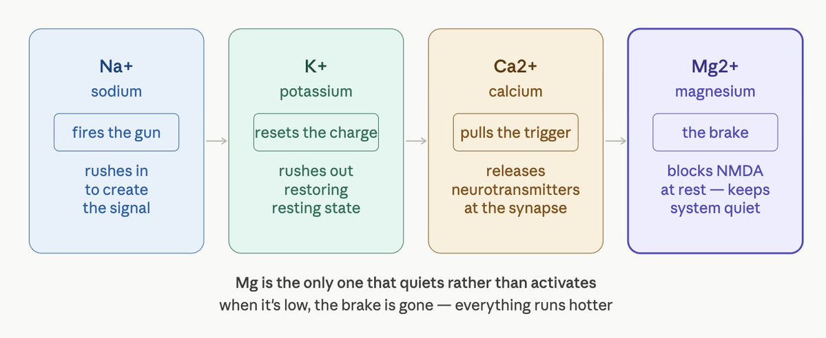 Magnesium is a structural brake on nervous system excitability. When it's low, the brake is gone