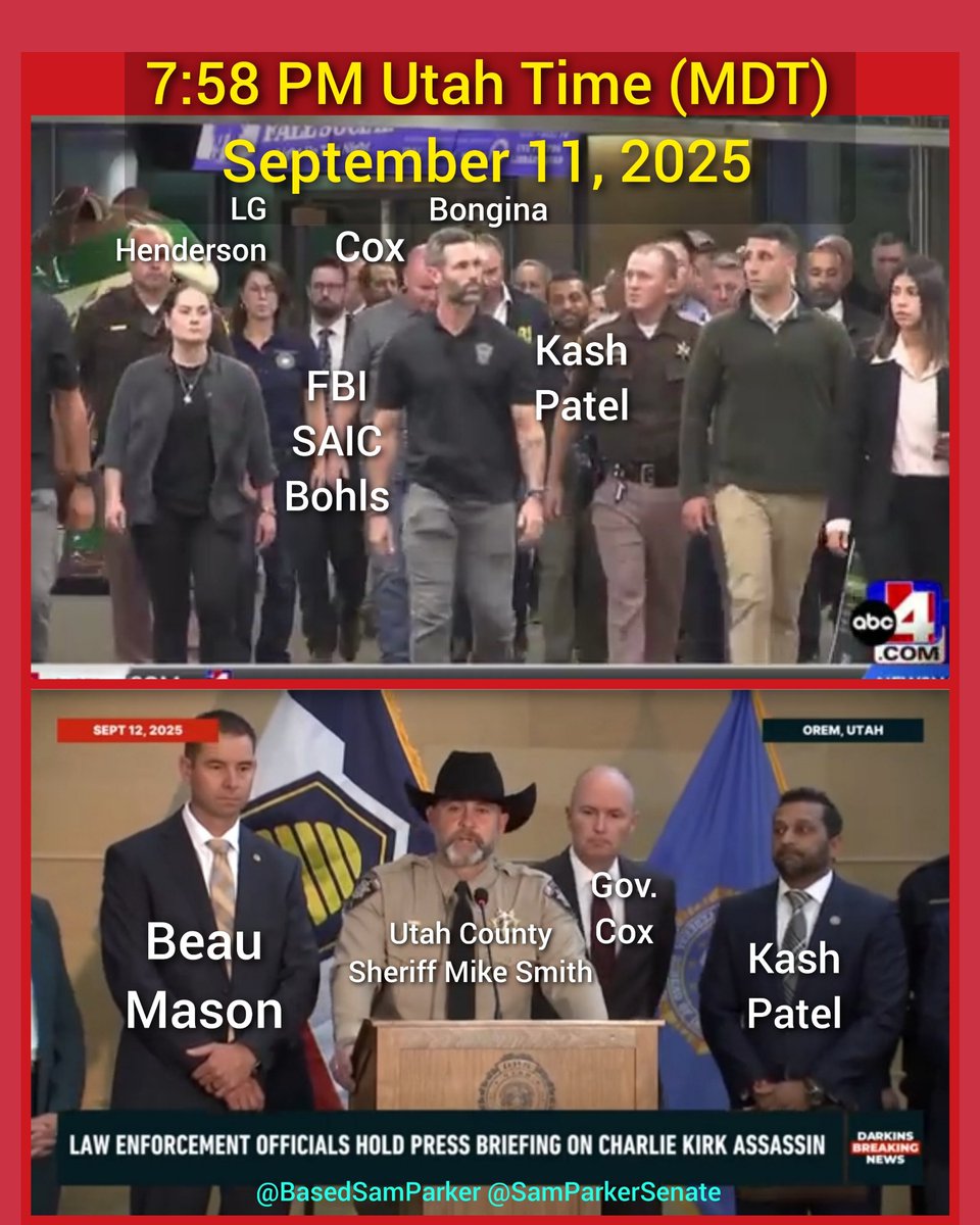 1. FBI Director Kash Patel 2. FBI Deputy Director Dan Bongino (whose wife works for TPUSA) 3. FBI SAIC Robert Bohls (appointed head of the SLC FBI field office by Kash Patel a few weeks earlier in August 2025) 4. Utah Governor Spencer Cox 5. Utah Lt. Gov. Deidre Henderson 6. Utah County Sheriff Mike Smith 7. Utah County Officer Brian Davis 8. Washington County Sheriff Nate Brooksby 9. Retired Washington County Sheriff’s Office detective Scott Messinger 10. Unidentified Washington County Sheriff's Deputy(ies) present when Tyler was mirandized at 6:25 PM 11. Utah Attorney General Derek Brown 12. Commissioner of the Utah Department of Public Safety Beau Mason (appointed by Spencer Cox in June 2025)