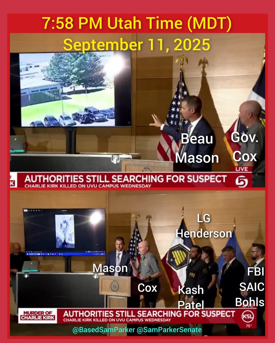 ▪️7-7:30 AM: Kash Patel announces that it was a "33-hour manhunt," which would have been 9:23 PM September 11, Utah time. 3 hours AFTER Tyler Robinson was first mirandized at the Sheriff's office.