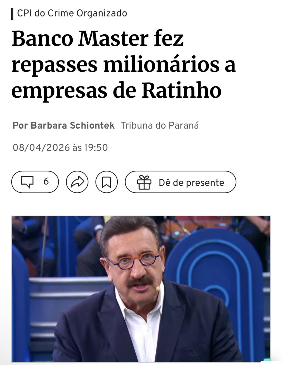 Segundo documentos da Receita Federal obtidos pela Folha de S.Paulo e Gazeta do Povo, duas empresas da família do apresentador Ratinho embolsaram R$ 24 milhões do Master entre 2022 e 2025. A Massa Intermediação ficou com R$ 21 milhões. A Gralha Azul, com R$ 3 milhões.