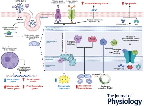 Even without infection, transfection with specific coronaviral proteins opens the MTP and depolarizes mitochondria, or activates DRP1 and AIF, promoting AEC damage or apoptosis, thereby contributing to diffuse alveolar damage. In human PASMCs, coronaviral M and Nsp9 proteins suppress hypoxic pulmonary vasoconstriction (HPV), homeostatic mechanism in PASMCs that uses a mitochondrial oxygen sensor to redistribute blood flow to well-ventilated lung regions during pneumonia.