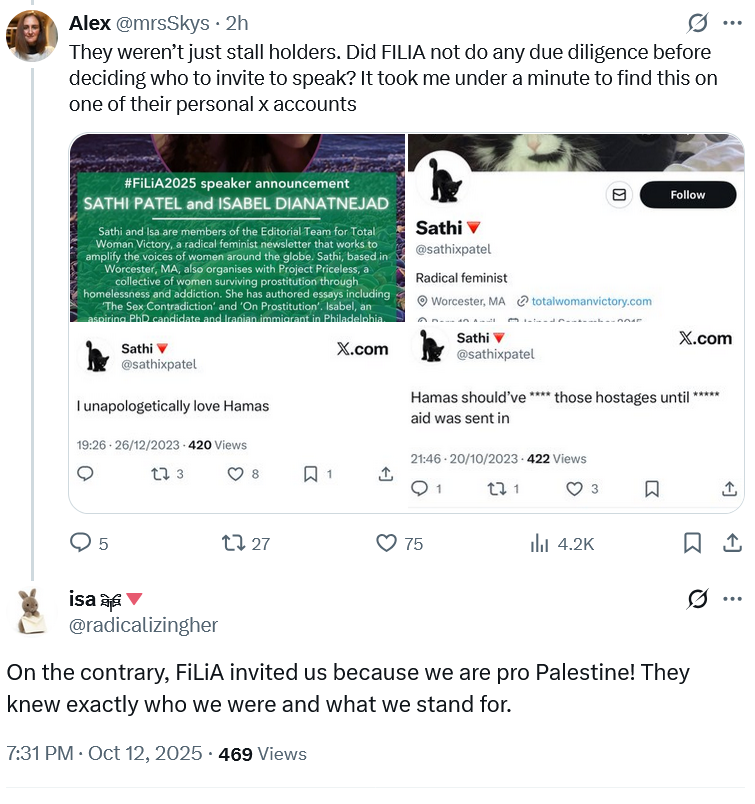@FiLiA_charity Her colleague at "Total Woman Victory" and fellow Hamas fangirl Pardis Dianatnejad aka Isa, confirms that @FiLiA_charity invited them BECAUSE they are pro-Palestine.