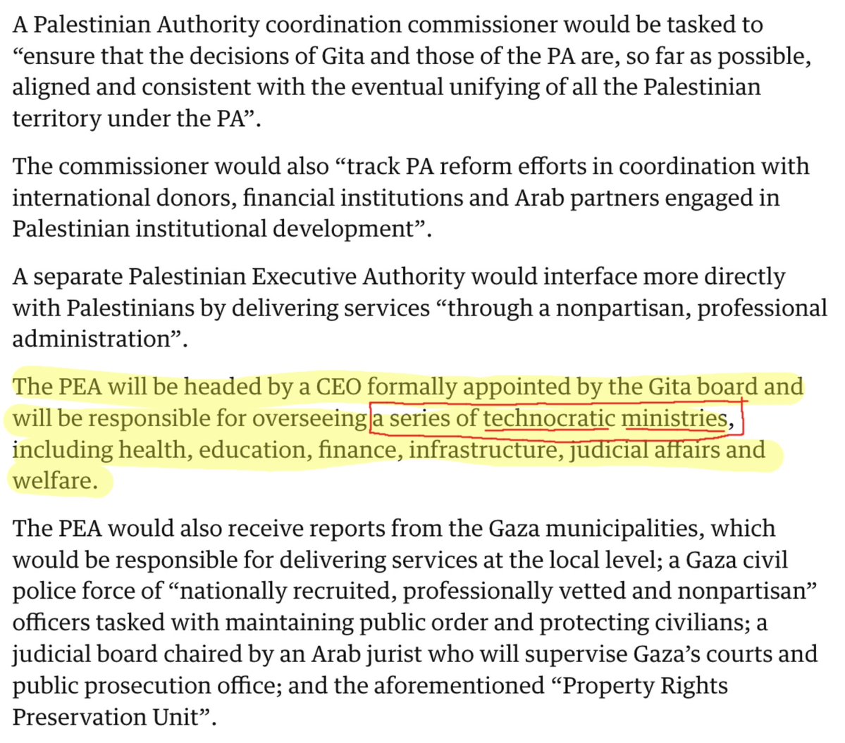 The article also noted that “a separate Palestinian Executive Authority” would be “headed by a CEO formally appointed by the Gita board” and would “be responsible for overseeing a series of technocratic ministries, including health, education, finance, infrastructure, judicial affairs, and welfare.”