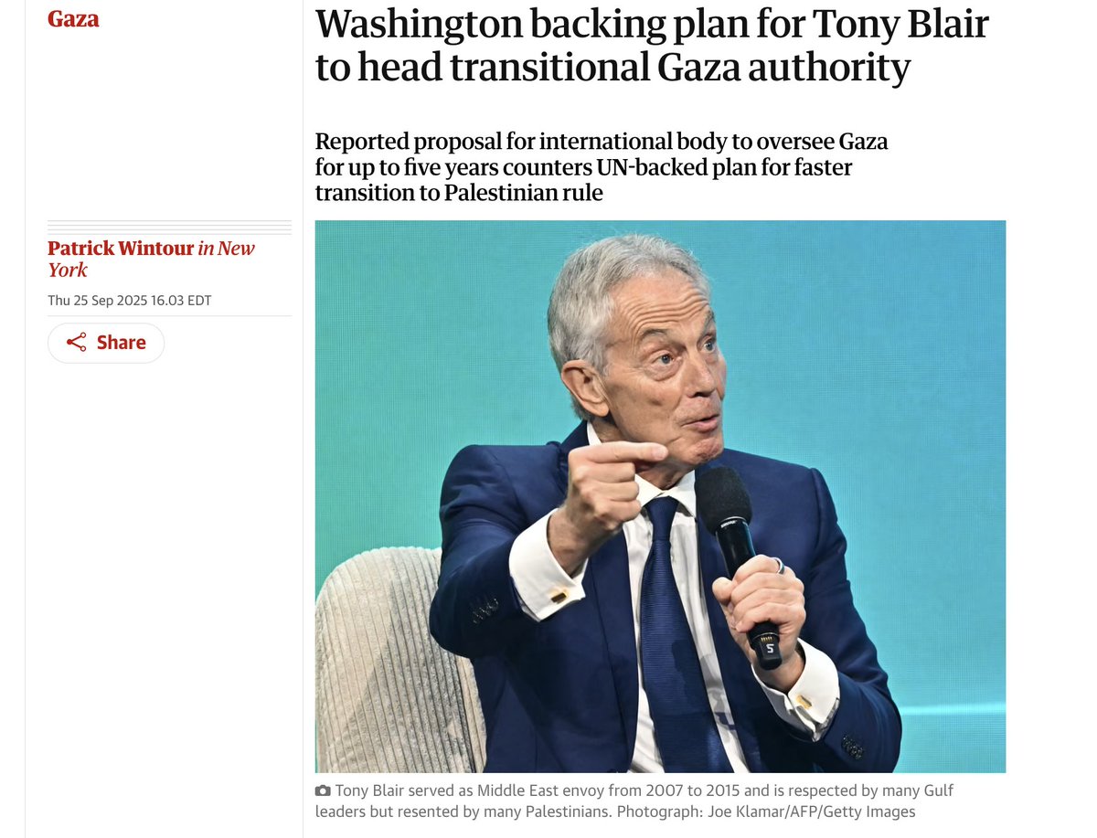 (3/22) “Under the proposal, Blair would lead a body called the Gaza International Transitional Authority (Gita) that would have a mandate to be Gaza’s ‘supreme political and legal authority’ for as long as five years.” — The Guardian, September 25, 2025