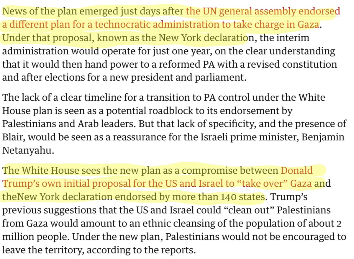 In an article posted by The Guardian four days prior to Trump’s announcement, the media outlet described how Blair would oversee the Gaza International Transitional Authority (Gita) and would be “a compromise between Donald Trump’s own initial proposal for the US and Israel to ‘take over’ Gaza and the New York [‘technocratic’] declaration endorsed by more than 140 states.”