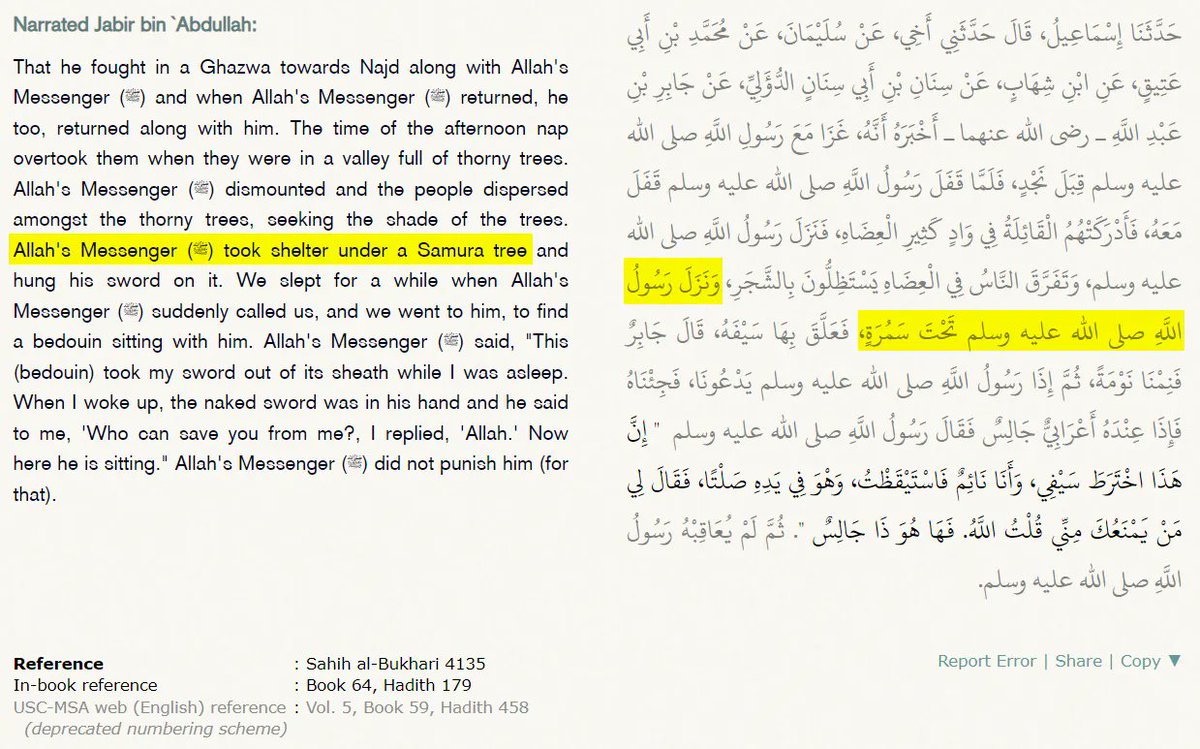 Allah's Messenger (ﷺ) took shelter under a Samura tree.