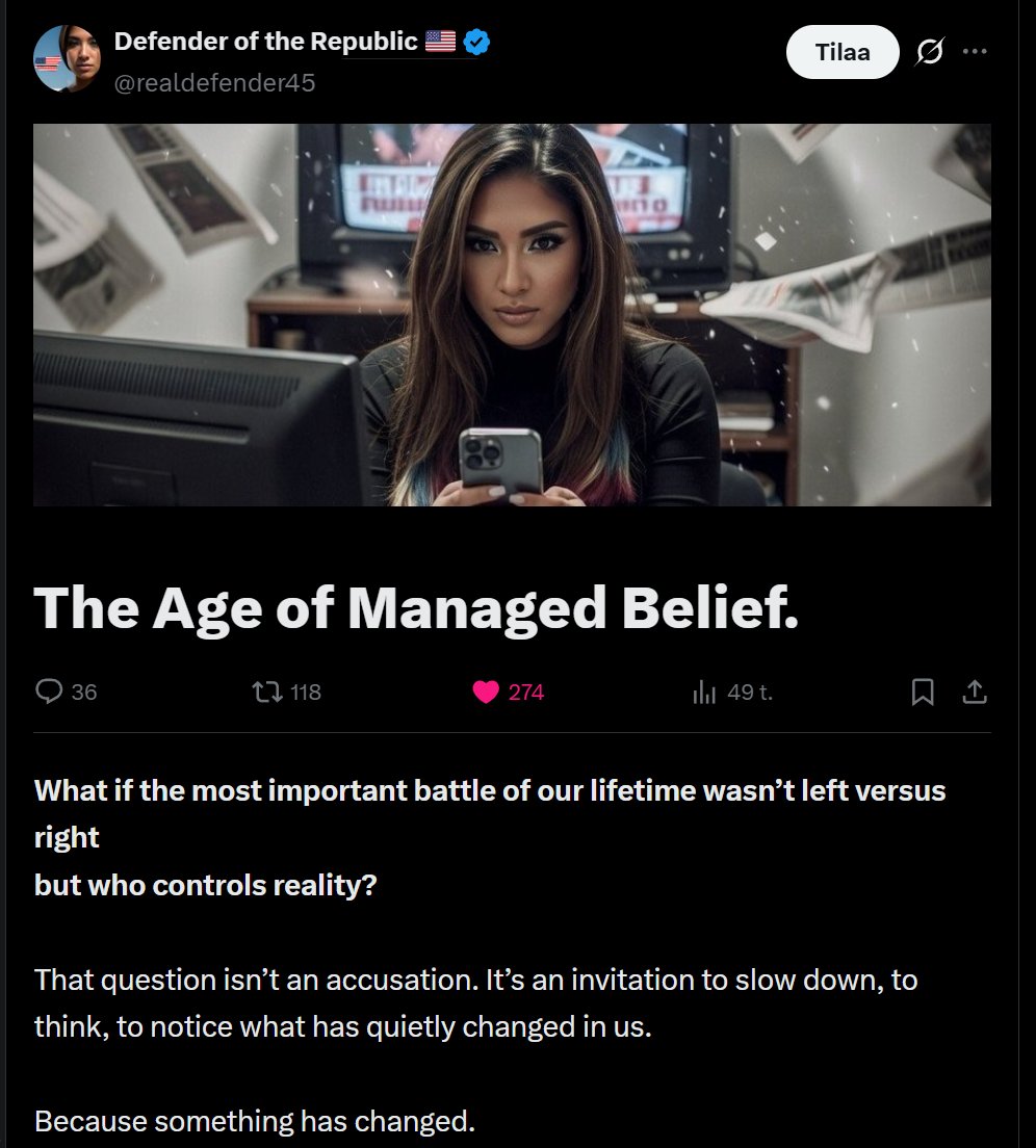 ".. Elämme aikakaudella, jossa uskomukset eivät enää muodostu ensisijaisesti kokemusten, keskustelujen tai päättelyn kautta, vaan hallitsemisen ja kontrolloinnin kautta. Narratiivit kuratoidaan, niitä vahvistetaan ja suojellaan. Konsensus muodostuu jo ennen kuin kysymykset sallitaan. Ihmisille ei sanota, mitä heidän tulee ajatella, vaan heitä ohjataan kohti sitä, mitä on hyväksyttävää uskoa.