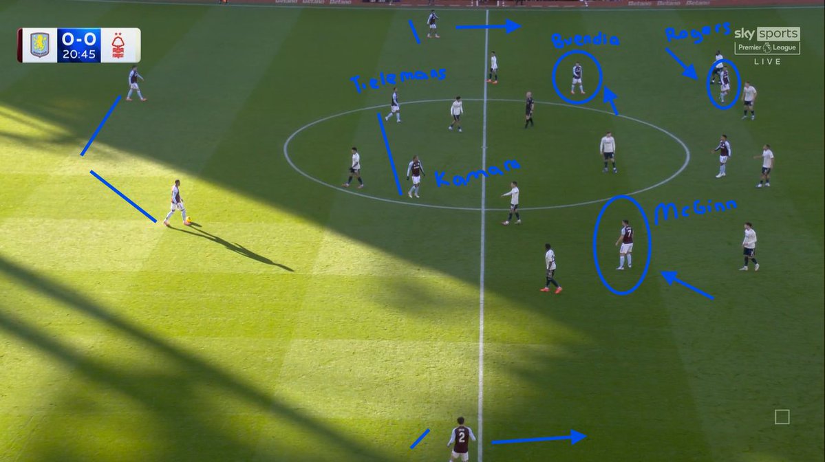 Bir diğer örnek Nottingham Forest maçından. Burada da iki stoper arkada kalırken, merkezde Tielemans–Kamara ikilisi yer alıyor. Bekler Cash ve Maatsen yüksek konumlanıyor. McGinn iç koridora devrilirken, Buendía on numara rolünden sağ tarafa kayıyor. Rogers ise sol kenardan forvetleşerek Watkins’in yanına yaklaşıyor. İlk gösterdiğimiz Young Boys maçındaki görüntüde ise iç koridorlarda Sancho ve Rogers yer alıyordu. Yani Aston Villa, oyuncu rolleri açısından oldukça hibrit bir yapı sergiliyor.