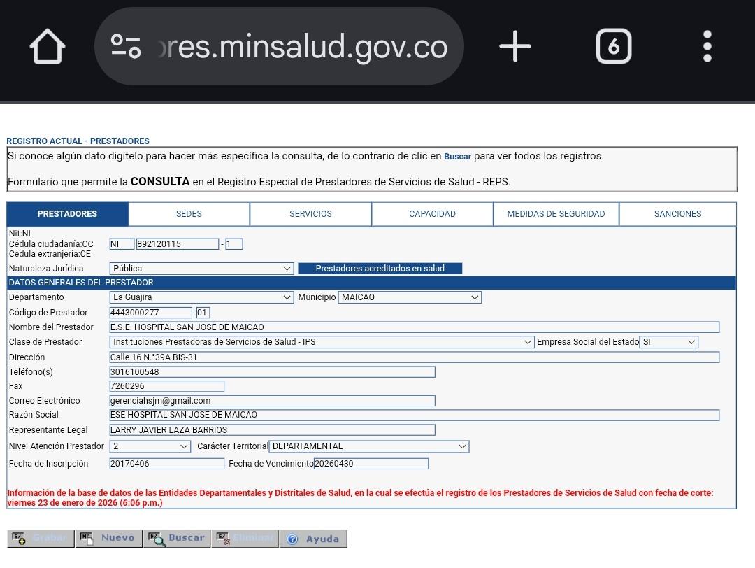En REPS, el Hospital San José de Maicao existe y está habilitado. Perfecto. Lo que sigue es mirar qué servicios tiene habilitados, en qué sedes, y con qué capacidad real. Ahí empieza la evidencia...