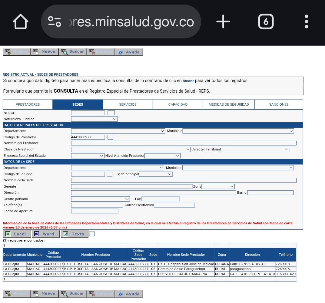 REPS muestra que Maicao tiene 3 sedes: Maicao, Centro de Salud Paraguachón y Puesto de Salud Carraipía. No aparece Nazareth como sede del Hospital de Maicao (porque es una sede de Campaña o transitoria). Eso importa para operación y responsabilidad...