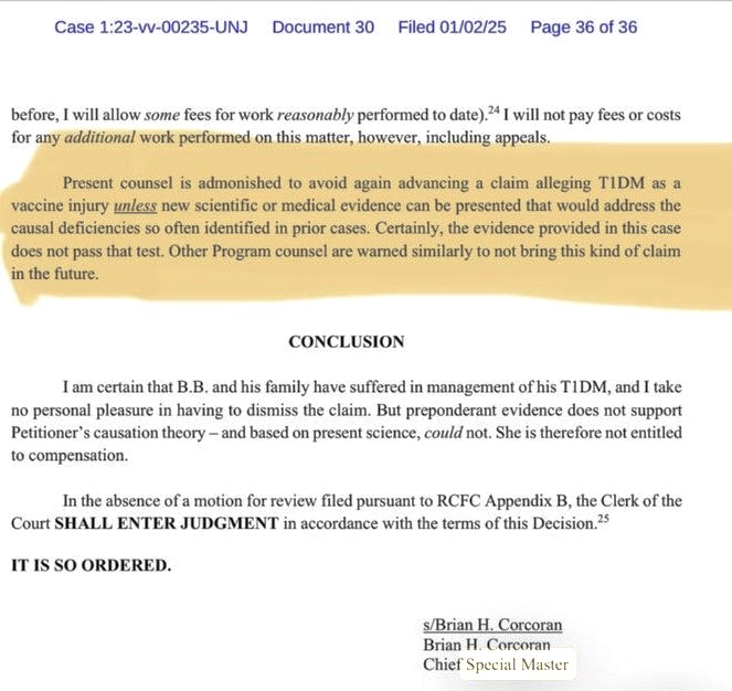 Not only was the case denied (despite clear evidence of a new diagnosis immediately after vaccination) but the case was used by the "judge" to essentially ban ANY further cases that alleged a link between new diabetes and a routine vaccine.