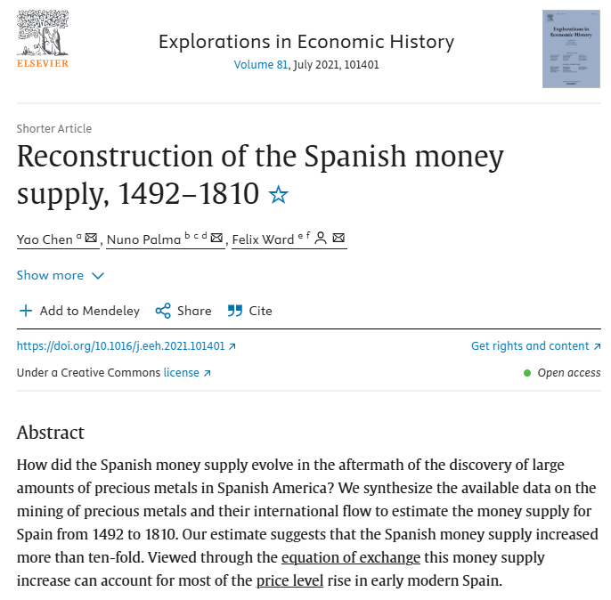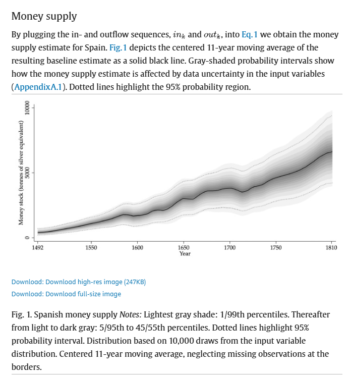 Depois eles calculam o impacto disso sobre a oferta monetária (quantidade de dinheiro disponível) na Espanha. Ela cresceu 15x durante o período! Note como as estimativas crescem monotonicamente em paralelo à extração metálica na América.