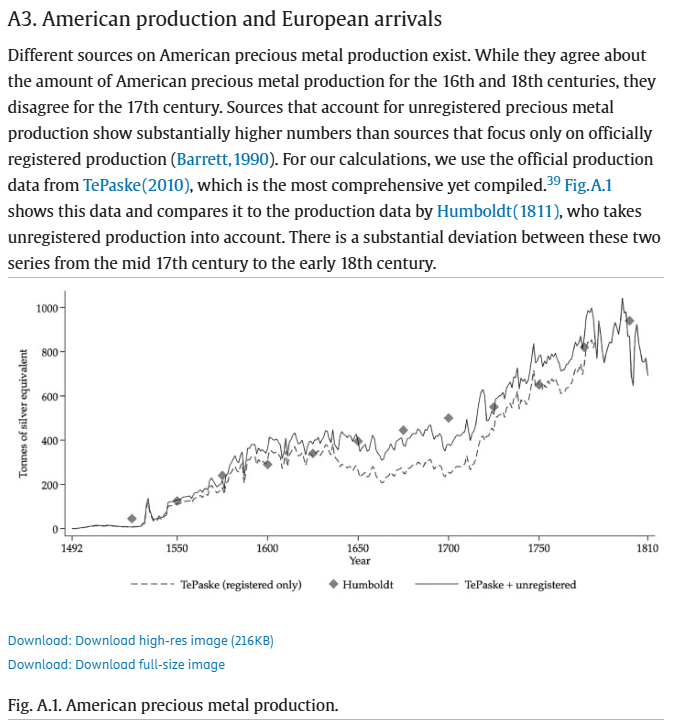 O primeiro esforço deles foi juntar a produção de metais preciosos (ouro + prata) na América espanhola. Chegam numa métrica de "equivalentes em prata" da produção anual. Ela cresce ao longo dos séculos.